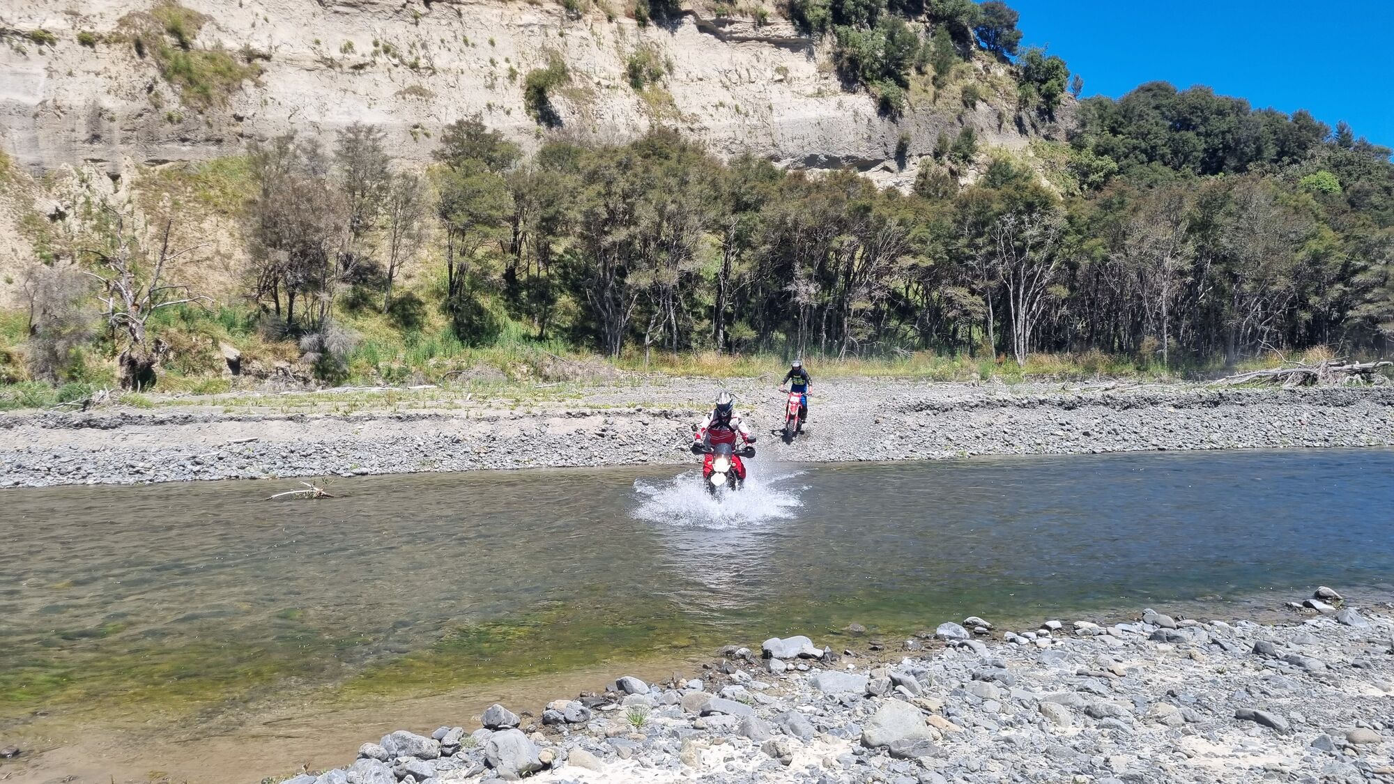 Some warnings before attempting these streams. Be prepared to undrown your bike. Don't ride through a crossing if you can't see the bottom. It is best practice to cross immediately upstream from a rapid section, the water is likely to be shallower. It is always easier to ride downstream rather than upstream. Master your clutch and throttle control to maintain balance in the water when you ride into unseen rocks. This area is notorious for soft sandy spots.