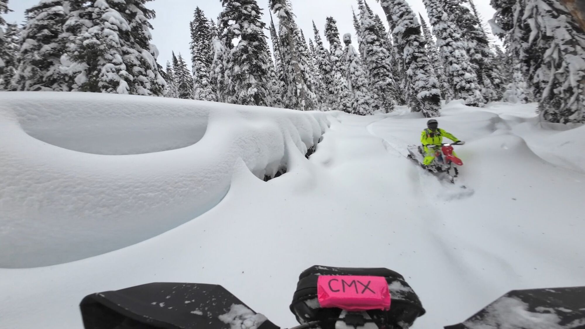 One of the best days ever. Great bikes, great weather, perfect snow, and our tiny 2 man group.